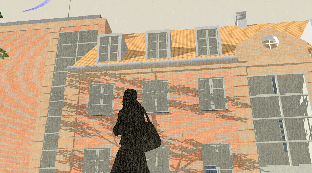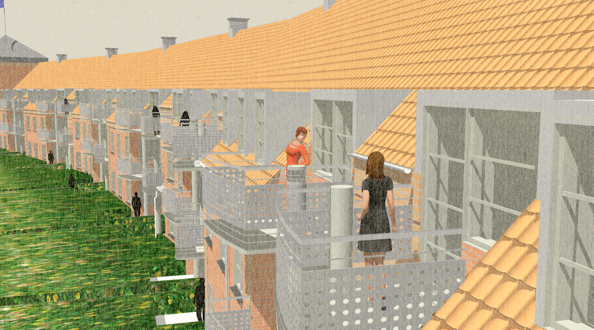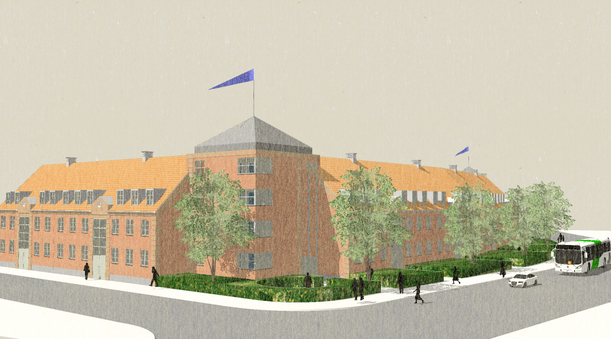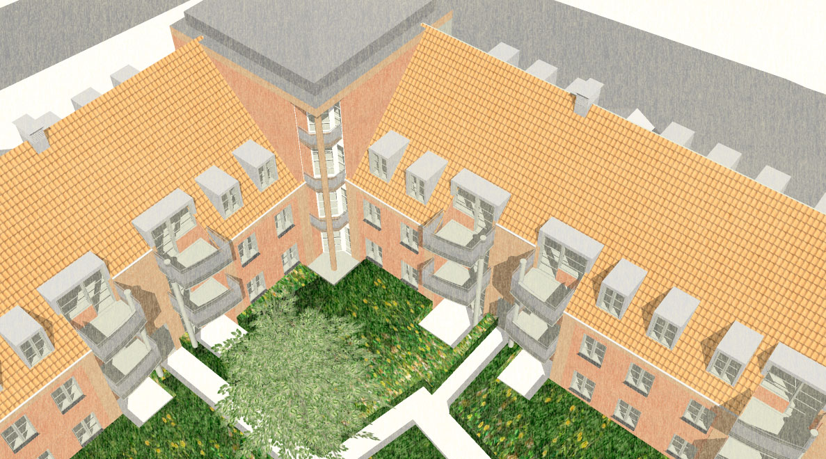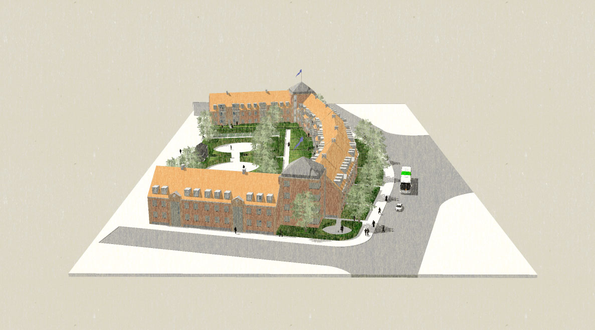 Blev bygget som karre' afslutning mod Dronningemaen. Boliger blev støjdæmpet mod Dronningemaen.