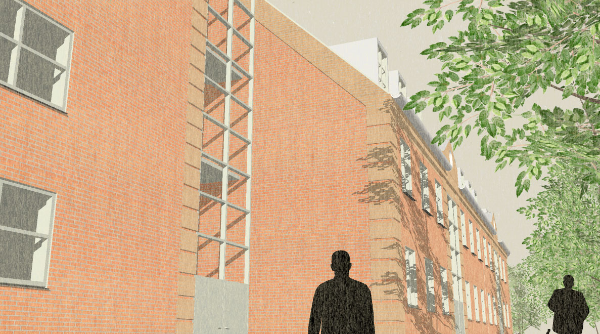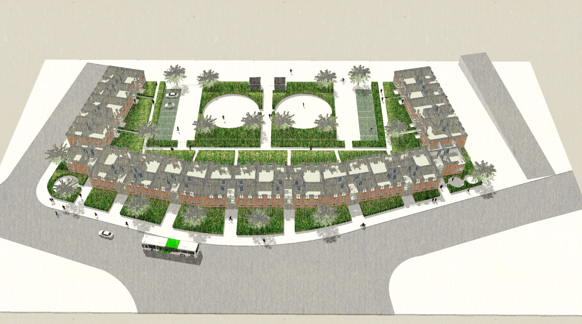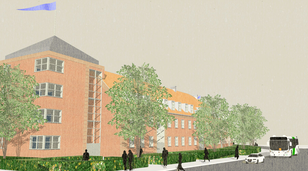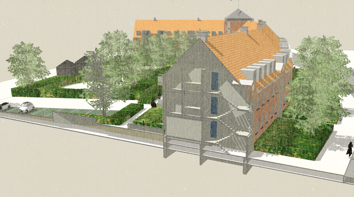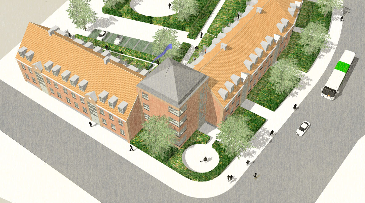 Blev bygget som karre' afslutning mod Dronningemaen. Boliger blev støjdæmpet mod Dronningemaen.